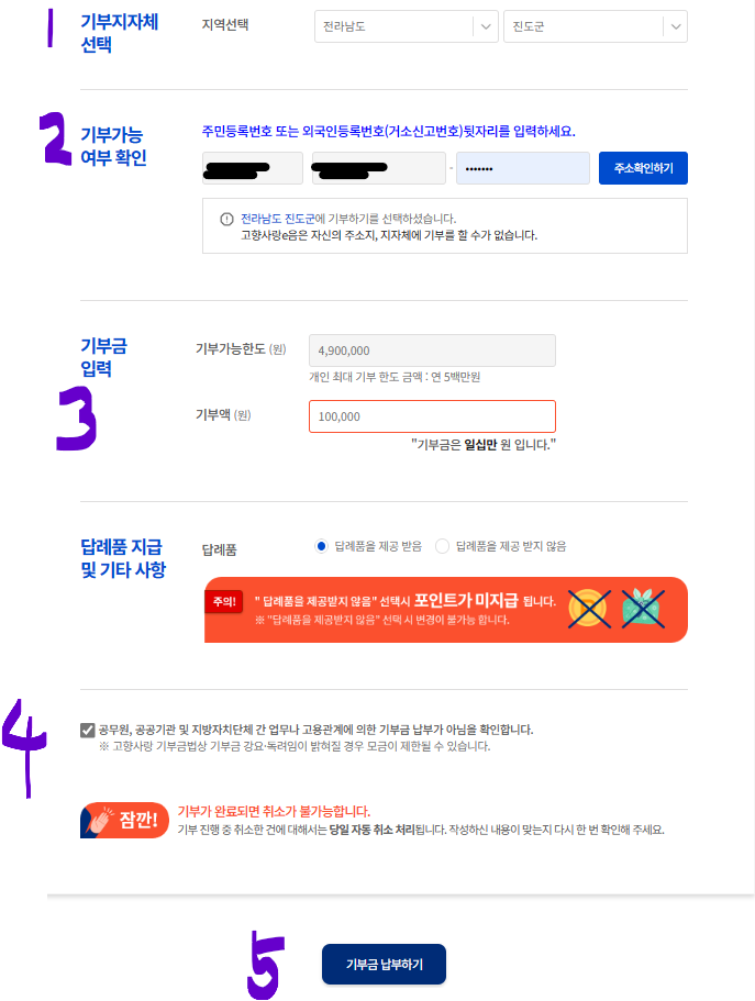 1번 : 본인이 선택한 답례품의 지자체를 선택하세요.