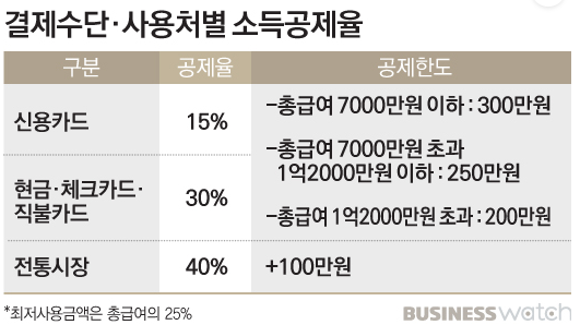 즉, 신용/체크카드로 한도를 다 채운 다음 전통시장 사용료 250만원(40%니 100만원)까지는 공제가 더 된다는 이야기죠.