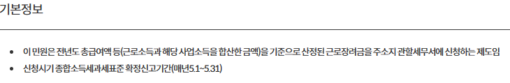 5월 1일부터 31일까지는 정기 신청 기간으로 근로소득자를 비롯해 사업자, 종교인 소득자 모두 신청 요건에 부합한다면 신청할 수 있는데요. 지급일은 8월 말에서 9월 초 정도입니다.